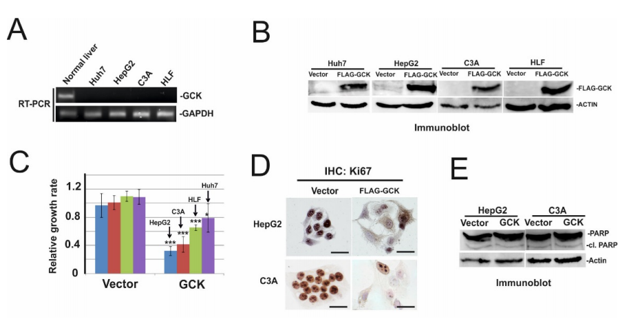 由于葡萄糖代謝的重編程是 HCC 的標(biāo)志之一,進(jìn)一步關(guān)注表征一種TSG 候選物 – 葡萄糖激酶 (GCK) 的抗增殖作用。為了檢驗(yàn)GCK是否可能在HCC 細(xì)胞中發(fā)揮抑癌基因的作用,首先分析了GCK在正常人肝臟和四種HCC細(xì)胞系中的表達(dá),即Huh7、HepG2、C3A 細(xì)胞和 HLF 細(xì)胞(圖3A)。發(fā)現(xiàn)GCK在正常肝臟中高表達(dá),在Huh7、HepG2、C3A細(xì)胞和HLF細(xì)胞中未檢測(cè)到有表達(dá)。然后在這些細(xì)胞系中過(guò)表達(dá)帶有FLAG 標(biāo)記的GCK(圖3B) ,并使用結(jié)晶紫實(shí)驗(yàn)檢查細(xì)胞生長(zhǎng)。GCK 的過(guò)表達(dá)強(qiáng)烈抑制 HepG2 和 C3A 細(xì)胞的生長(zhǎng),而在 HLF 和 Huh7 細(xì)胞中生長(zhǎng)抑制的效果不太明顯,但仍很顯著(圖3C)。利用增殖標(biāo)記物Ki67進(jìn)行的免疫組化染色證實(shí)了過(guò)表達(dá)GCK的HepG2和C3A細(xì)胞生長(zhǎng)受到抑制(圖3D)。為了檢查GCK過(guò)表達(dá)后HepG2和C3A細(xì)胞的減少,是否是因?yàn)樵鲋呈艿揭种坪褪艿降蛲稣T導(dǎo),對(duì)凋亡標(biāo)記物PARP進(jìn)行了免疫印跡雜交實(shí)驗(yàn)。如圖3E所示,在GCK過(guò)表達(dá)的細(xì)胞中PARP沒(méi)有增加。這些數(shù)據(jù)表明GCK的過(guò)表達(dá)抑制細(xì)胞增殖但不誘導(dǎo)細(xì)胞凋亡。