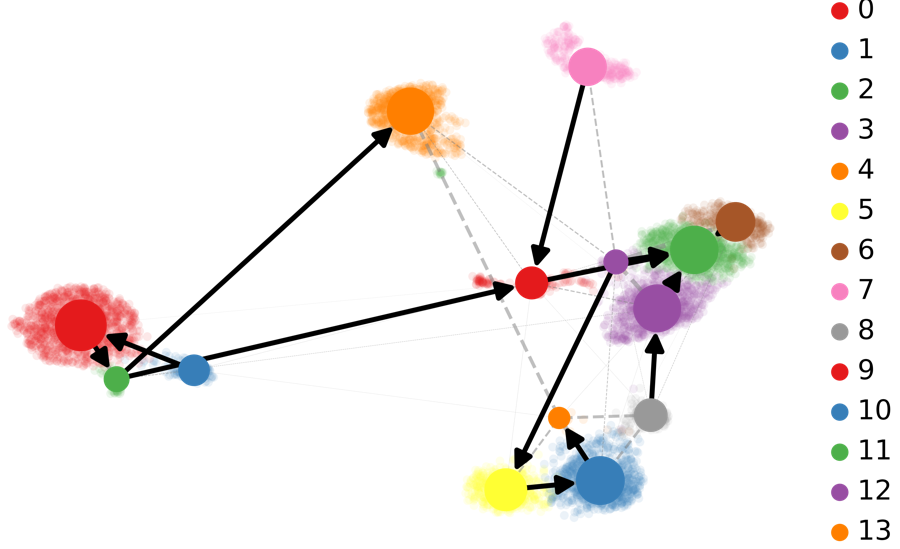 基于RNA-速度的PAGA分析:PAGA提供了軌跡推斷構(gòu)圖的方法,其中加權(quán)邊對應(yīng)于兩個(gè)集群之間的連接。在這里,PAGA通過速度推斷的方向性進(jìn)行了擴(kuò)展。