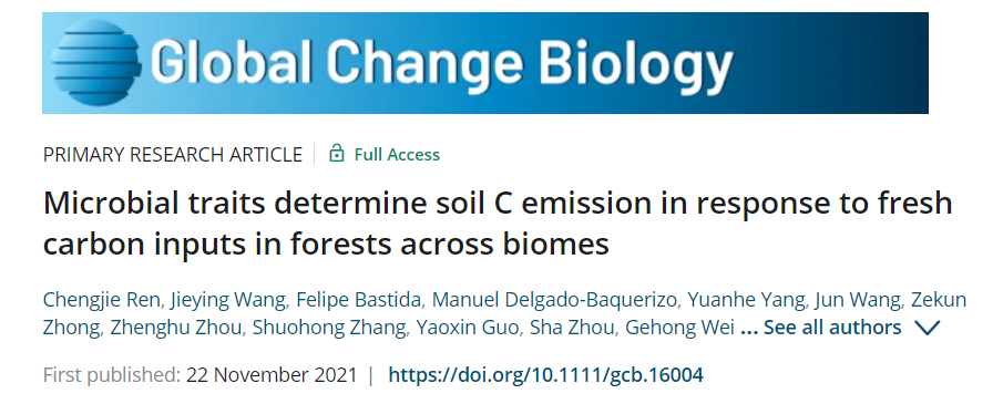 2. Ren C, Wang J, Bastida F, et al. Microbial traits determine soil C emission in response to fresh carbon inputs in forests across biomes[J]. Global change biology, 2021.