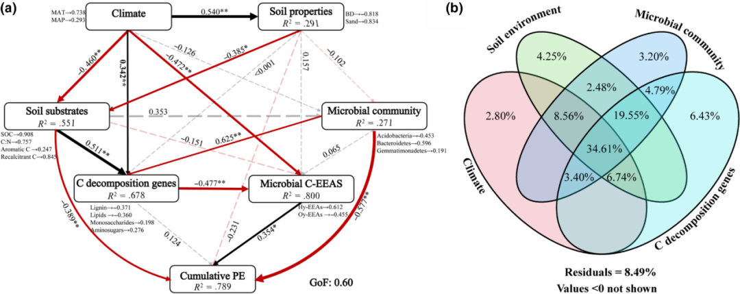 圖1 環(huán)境活力對(duì)累積啟動(dòng)效應(yīng) (PE) 的影響 (a) PLS-PM有向圖 (b) VPA分析顯示氣候、土壤環(huán)境、微生物群落和C分解基因?qū)鄯e啟動(dòng)效應(yīng)的相對(duì)貢獻(xiàn)