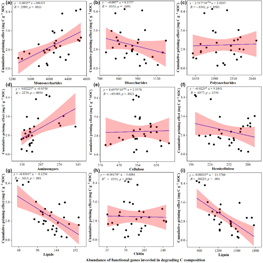 圖2?累積啟動(dòng)效應(yīng)與 (a-c)不穩(wěn)定C降解功能基因豐度 (d-i)穩(wěn)定C降解功能基因豐度之間的關(guān)系
