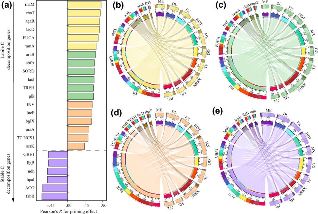 圖3 預(yù)測(cè)基因在整個(gè)森林生物群系中的啟動(dòng)效應(yīng) (a) 所選關(guān)鍵基因的變化(由與啟動(dòng)效應(yīng)的顯著相關(guān)性表示:p?<0 .05),(b-d) 所選基因在森林生物群落中不穩(wěn)定C分解的分布 (e) 用于在森林生物群系中穩(wěn)定C分解的選定基因的分布