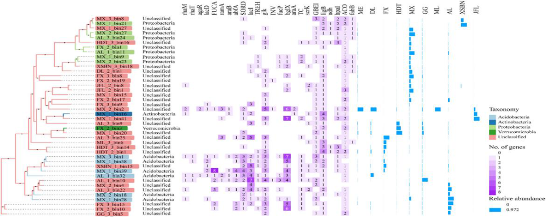 對(duì)于分類學(xué),42個(gè)MAG在門水平上代表了變形菌門(七個(gè))、酸桿菌門(六個(gè))、放線菌門(一個(gè))和疣微菌門(一個(gè))中的多種細(xì)菌門。在變形菌門中,Alphaproteobacteria綱(四個(gè))和Rhizobiales目(兩個(gè))是最豐富的。在酸桿菌中,Solibacteres綱(四個(gè))和?Candidatus Solibacter usitatus?種(四個(gè))代表更多。此外,基于系統(tǒng)發(fā)育關(guān)系,來(lái)自16S rRNA 系統(tǒng)型的五個(gè)未分類bin與相似的分類bin聚類。