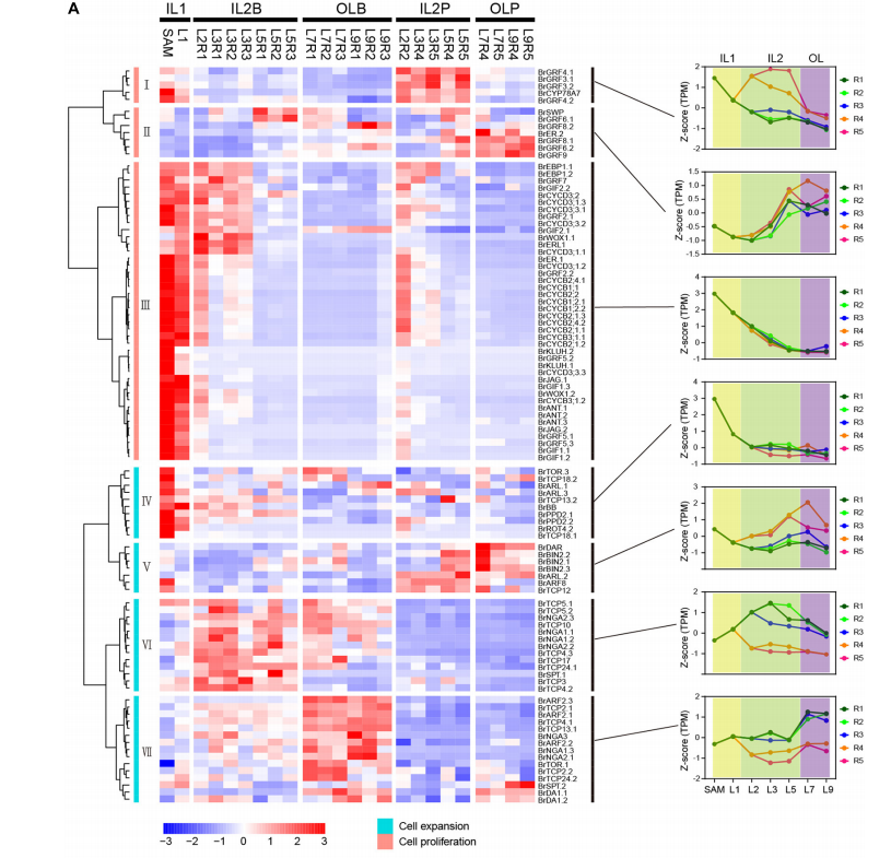 作者鑒定了細胞增殖相關(guān)基因和細胞擴張相關(guān)基因。結(jié)果表明,大多數(shù)細胞增殖基因在IL1HLs中達到峰值,包括SAM和L1,但在IL2HLs和外HLs中迅速下調(diào)(圖3A),表明細胞增殖基因在不斷生長的內(nèi)葉的起始過程中發(fā)揮重要作用。與細胞增殖基因不同,大部分細胞擴張基因在IL2HLs和外HLs的葉片區(qū)域高表達,且表達模式更為多樣,分為4個簇(圖3A)。此外,大部分細胞擴張基因在IL2HLs和外層HLs之間表現(xiàn)出不同的表達模式,導(dǎo)致L7細胞分裂和細胞擴張調(diào)控的變化明顯高于IL2HLs和外層葉(圖3B)。