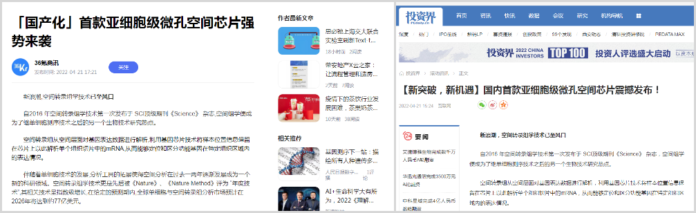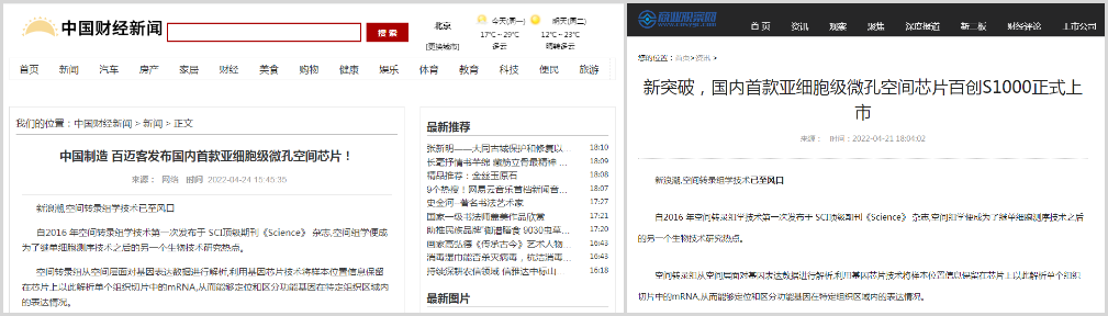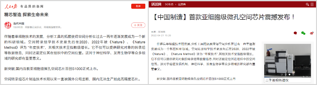 4月20日,百邁客生物在北京發(fā)布了亞細(xì)胞級(jí)微孔空間組學(xué)芯片“百創(chuàng)S1000”,該芯片可以讓研究者們可以結(jié)合不同階段圖譜數(shù)據(jù),獲得全面的亞細(xì)胞級(jí)時(shí)空動(dòng)態(tài)表達(dá)圖譜,從而為疾病的診斷治療及藥物研發(fā)提供更有力的決策依據(jù),相比目前國(guó)外空間轉(zhuǎn)錄組測(cè)序芯片精度提高了近400倍,同時(shí)還能拍攝高清HE染色圖片!