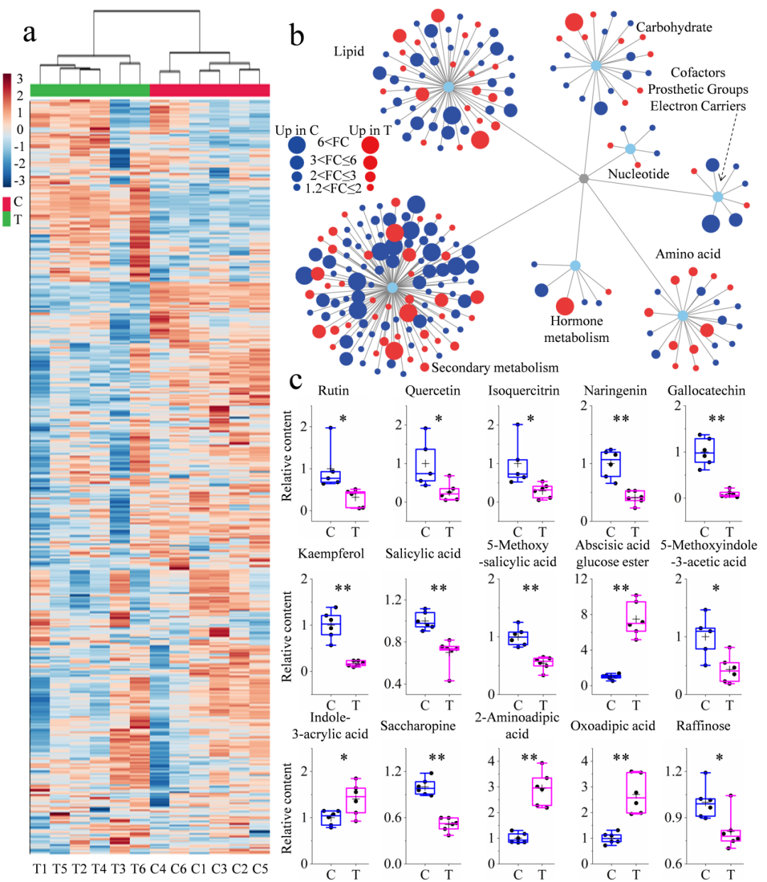 圖2四環(huán)素改變了代謝組,特別是次生代謝和脂質代謝。a、代謝物的熱圖譜聚類,顯示代謝物的相對含量。b、差異代謝物根據(jù)其功能/通路的綜合性進行聚類。?圓的大小與折疊變化(FC)值成正比。?紅色表示在四環(huán)素中有更高的FC?(T),而藍色表示在對照中有更高的FC?(C)。c、受四環(huán)素影響的代謝途徑相關代謝物的箱式圖。?*在P?<?0.05時差異顯著,**在P?<?0.01時差異顯著。