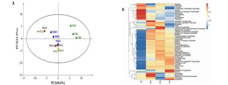 Fig. 3 對不同程度油斑病的青檸皮次級代謝產(chǎn)物和三種初級代謝產(chǎn)物(酪氨酸、亮氨酸和苯丙氨酸)進行主成分分析(A)和層次聚類分析(B)