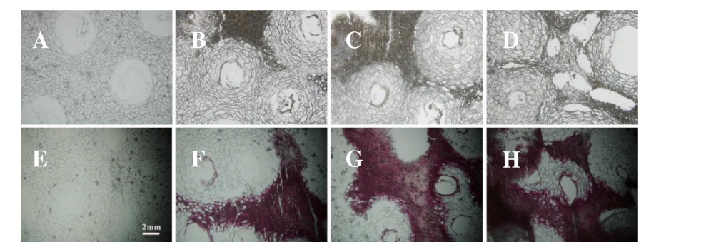 為了從形態(tài)學(xué)角度揭示油斑病對檸檬皮中木質(zhì)素積累的影響,采用間苯三酚-鹽酸反應(yīng)對健康和油斑病檸檬皮的橫截面進行了木質(zhì)素化研究。在染色前,健康檸檬皮的細胞排列整齊,沒有塌陷,而輕度油斑病檸檬皮的細胞似乎塌陷并堆積在一起。隨著油斑病嚴(yán)重程度的增加,細胞的堆積越來越明顯,細胞間組織的塌陷導(dǎo)致不同程度的破裂,特別是在油斑病嚴(yán)重的檸檬皮中,可以觀察到許多裂痕洞(Fig. 4)。