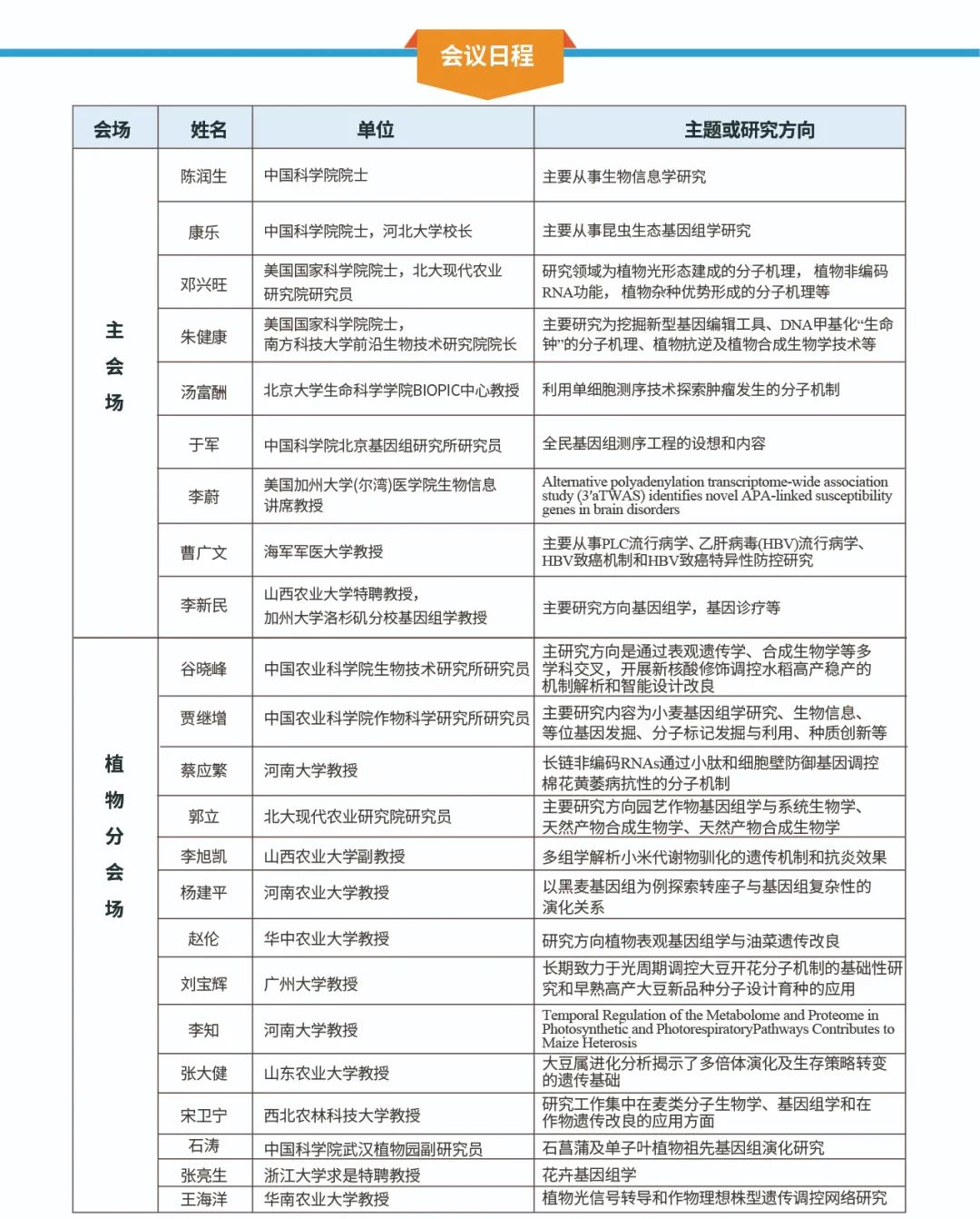 隨著基因組組裝(GA)、種質(zhì)資源鑒定(GC)、基因功能鑒定(GI)、基因組育種(GB)、基因編輯(GE)的5G育種策略快速發(fā)展,以高通量測序技術(shù)為基礎(chǔ)的組學(xué)研究已經(jīng)廣泛應(yīng)用于植物研究的各個領(lǐng)域。本次大會特邀植物功能基因組學(xué)、系統(tǒng)與進化植物學(xué)、表觀遺傳學(xué)等熱點領(lǐng)域?qū)<引R聚一堂,分享植物研究的前沿技術(shù)、經(jīng)驗成果及發(fā)展前景。