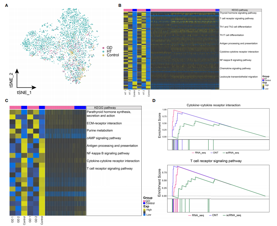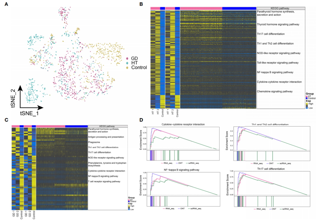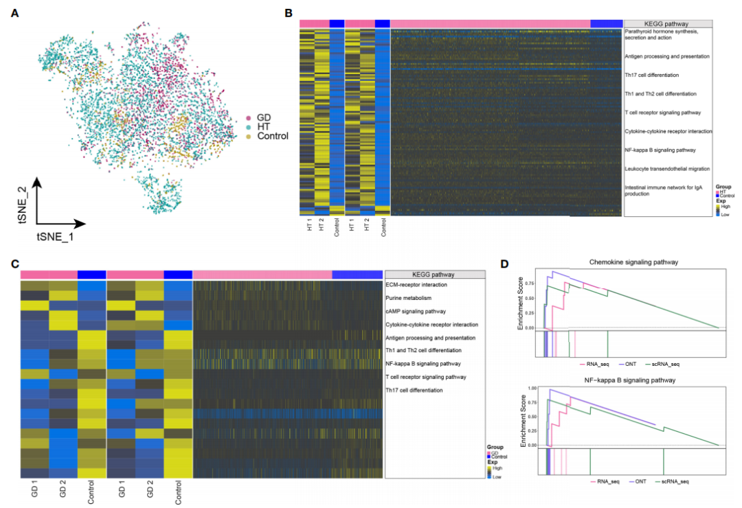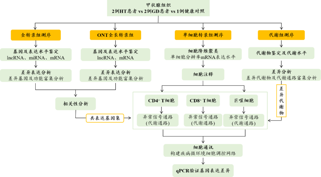 本研究基于HT患者、GD患者和健康對照甲狀腺組織的單細胞RNA測序、全轉(zhuǎn)錄組測序、ONT全長轉(zhuǎn)錄組測序和代謝組測序數(shù)據(jù),探討了HT和GD疾病微環(huán)境中基因表達失調(diào)和代謝信號異常的免疫細胞,構(gòu)建了免疫細胞的全局調(diào)節(jié)網(wǎng)絡,為進一步了解HT和GD免疫紊亂和代謝異常介導的疾病機制、更好地干預和治療疾病提供了科學的理論指導和研究基礎。