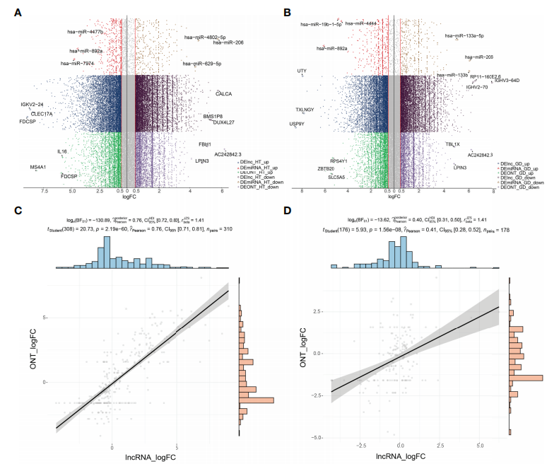 為了鑒定HT組和GD組中異常表達的lncRNA和miRNA,分別進行了ONT全長轉(zhuǎn)錄組測序和全轉(zhuǎn)錄組測序數(shù)據(jù)。差異表達分析結(jié)果顯示,共檢測到6,153?個?lncRNA?s和?741?個?miRNAs?在?HT?患者中存在差異表達(圖?1A);GD患者中檢測到5,492個lncRNAs?和?165?個?miRNAs?存在差異表達(圖?1B);相關性分析結(jié)果驗證了本研究中兩種測序方法的檢測穩(wěn)定性(圖?1C,?D)。
