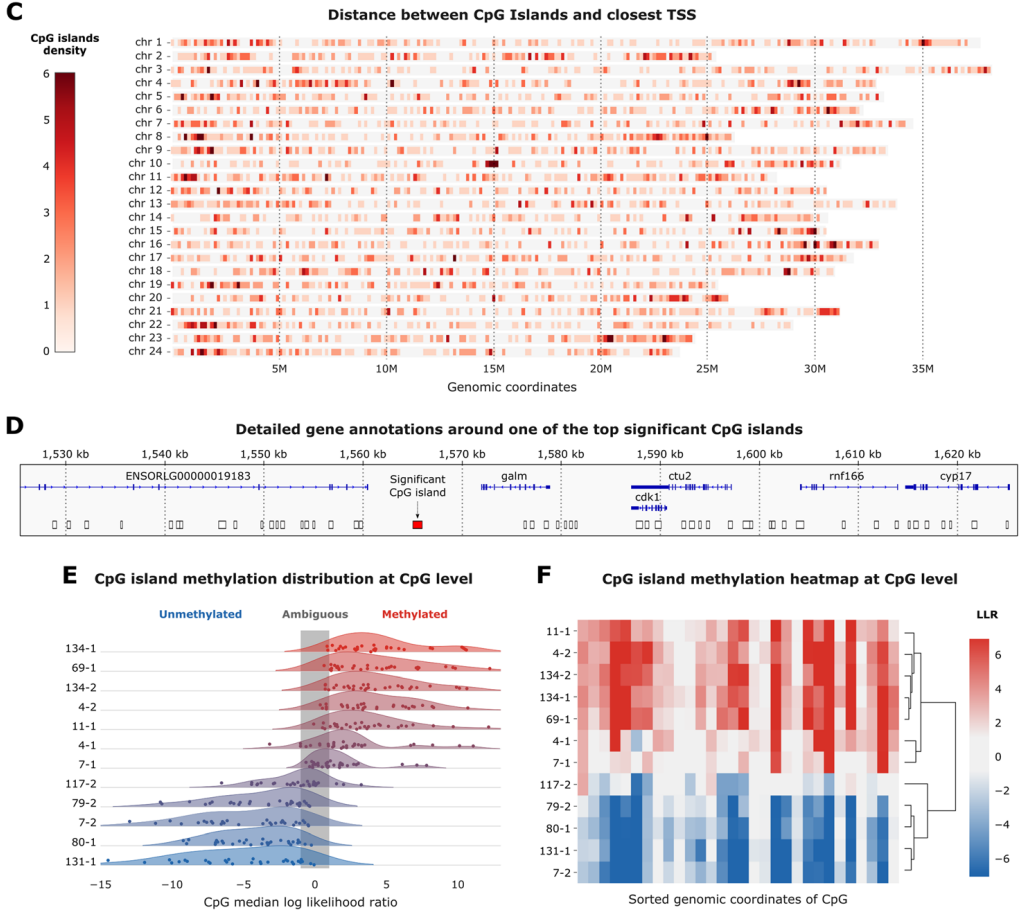 - 圖D中突出顯示的CpG島的對(duì)數(shù)似然比熱圖,按樣本分層聚類(lèi)。X軸上是按基因組位置排序的單個(gè)CpG