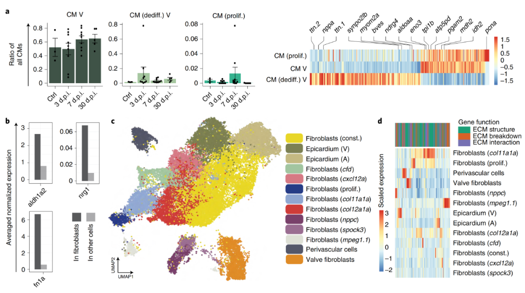 作者進(jìn)一步確定了心肌細(xì)胞中的一個(gè)轉(zhuǎn)錄亞結(jié)構(gòu)(圖2a)。除了以表達(dá)ATP合成和三羧酸循環(huán)相關(guān)基因(atp5pd和aldoaa)為特征的成年心肌細(xì)胞外,還檢測(cè)到一個(gè)較小的與心肌細(xì)胞發(fā)育相關(guān)的基因簇(ttn.1, ttn.2,?bves and synpo2lb),以及nppa——此前已被證明是邊界區(qū)去分化心肌細(xì)胞的標(biāo)記基因。這些去分化心肌細(xì)胞是心臟再生的標(biāo)志,其數(shù)量在3 d.p.i.(受傷后天數(shù))增加了(圖2a),并與已建立的標(biāo)記基因nppa22部分共定位于7 d.p.i.。