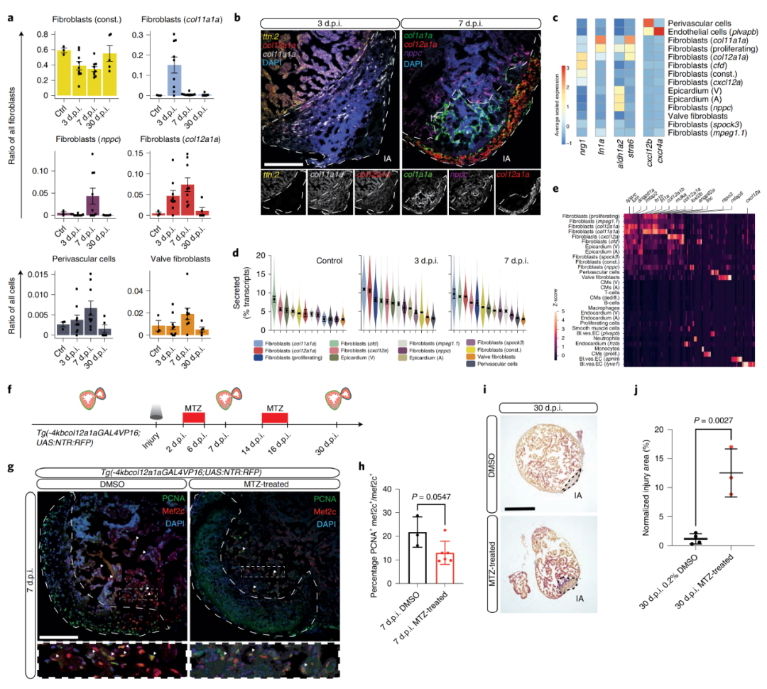 雖然作者對(duì)單細(xì)胞基因表達(dá)譜的時(shí)空分析強(qiáng)烈表明了瞬時(shí)成纖維細(xì)胞的再生功能,但還需要額外的實(shí)驗(yàn)來(lái)驗(yàn)證這一假設(shè)。為了從功能上評(píng)估瞬時(shí)col11a1a和col12a1a成纖維細(xì)胞的作用,作者使用硝基還原酶/甲硝唑(NTR/MTZ)系統(tǒng)進(jìn)行靶向細(xì)胞剔除。在MTZ處理后的轉(zhuǎn)基因系Tg(-4kbcol12a1a:GAL4VP16;UAS:NTR:RFP)中,在7 d.p.i.時(shí)相較于對(duì)照,5 / 6的心臟顯示心肌細(xì)胞增殖減少,col12aa表達(dá)細(xì)胞減少(圖3g,h)。在30d.p.i.時(shí),col12a1+細(xì)胞剔除顯著損害心臟再生(圖3i,j)??傊?,作者確定了心臟再生過(guò)程中具有潛在再生作用的三種成纖維細(xì)胞狀態(tài):col11a1a、col12a1a和nppc成纖維細(xì)胞?;蚣?xì)胞剔除數(shù)據(jù)強(qiáng)烈表明col12a1a表達(dá)細(xì)胞在再生生態(tài)位中發(fā)揮了作用。