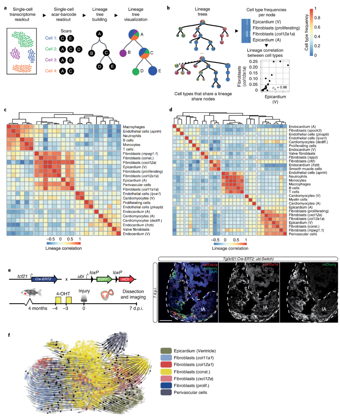 為了系統(tǒng)地識(shí)別健康和再生斑馬魚(yú)心臟中的細(xì)胞類(lèi)型,作者對(duì)損傷前后不同階段的大約20萬(wàn)個(gè)解離細(xì)胞進(jìn)行了scRNA-seq(圖1a)。為了準(zhǔn)確得到細(xì)胞發(fā)育起源的相關(guān)信息,作者還應(yīng)用了一種基于CRISPR–Cas9技術(shù)的大規(guī)模平行譜系追蹤方法,通過(guò)注射Cas9和針對(duì)多拷貝轉(zhuǎn)基因(斑馬魚(yú)系中的dTomato:一種用于斑馬魚(yú)細(xì)胞追蹤和譜系分析的多光譜細(xì)胞標(biāo)記)的sgRNA,創(chuàng)建了作為譜系條形碼的“遺傳疤痕”來(lái)記錄早期發(fā)育中的譜系關(guān)系。
