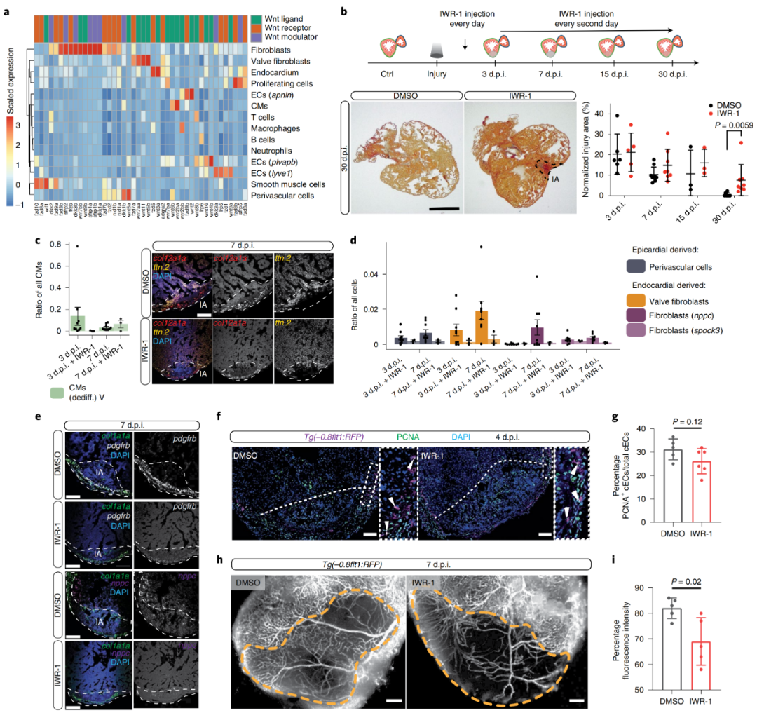 為了評(píng)估血管再生,作者對(duì)4d.p.i.下冠脈內(nèi)皮細(xì)胞(cECs)的增殖以及7 d.p.i.損傷區(qū)冠狀動(dòng)脈的覆蓋范圍進(jìn)行了定量分析。發(fā)現(xiàn)注射IWR-1后,cEC增殖在4 d.p.i.時(shí)有邊緣但不顯著的下降(圖6f,g)。然而,在7d.p.i.時(shí),損傷區(qū)冠狀動(dòng)脈覆蓋明顯減少(圖6h,j)。這些結(jié)果表明,Wnt抑制后觀察到的心臟再生減少至少部分是由血管再生缺陷介導(dǎo)的。這種缺陷似乎不是由cECs增殖減少引起的,而可能與血管再生的其他方面有關(guān)。