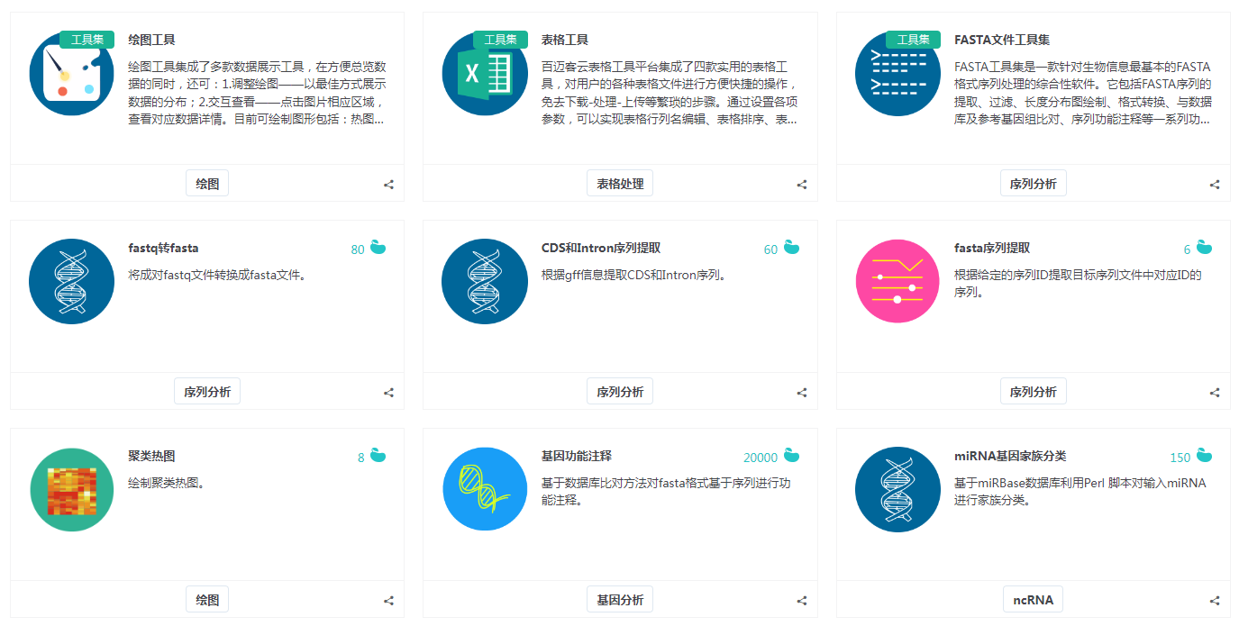 文獻(xiàn)里面好看又直觀的的美圖是如何制作出來(lái)噠?比如韋恩圖、箱形圖等。這就需要用到一些畫(huà)圖工具,這里推薦百邁客云在線分析工具,百邁客云有104款分析小工具,涵蓋基因分析、遺傳進(jìn)化、ncRNA、質(zhì)控、組裝、比對(duì)、數(shù)據(jù)提取、突變、統(tǒng)計(jì)、表格處理、繪圖、序列分析等12大功能,非常齊全。