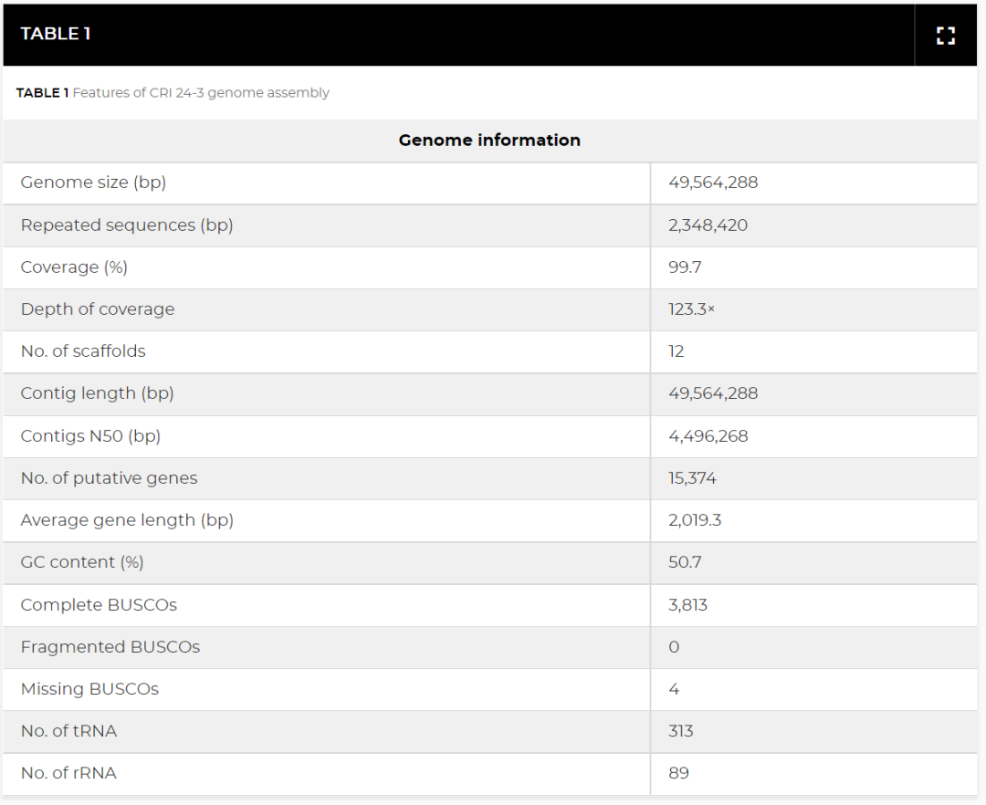 經(jīng)數(shù)據(jù)質(zhì)控后共獲得 452,011 條高質(zhì)量的clean reads(平均長度 13,525.1 bp)(表 S1)。CRI 24-3的 49.6 Mb 基因組是由 12 個(gè)contigs產(chǎn)生的,該基因組具有 4.5 Mb 的contigs N50 和 50.7% 的 GC 含量,覆蓋深度估計(jì)為 123.3 倍(圖 3;表 1)。基因組質(zhì)量評估結(jié)果表明,CRI 24-3 的基因組組裝完整且準(zhǔn)確,因?yàn)?CRI 24-3 中的單拷貝直系同源基因與 sordariomycetes_odb10 數(shù)據(jù)集中所有 3,817 個(gè)完整核心基因的 99.9% 匹配(表 1)。