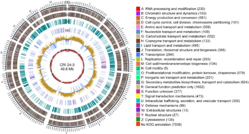 圖 3 CRI 24-3 基因組組裝圈圖。 (A) 12 個(gè)contigs的物理位置。標(biāo)尺?= 1 kb。(B 和 C)具有 KOG 類的正向和反向鏈上的蛋白質(zhì)編碼基因。(D)?重復(fù)序列。(E)?正向鏈上的 tRNA(藍(lán)色)和 rRNA(紫色)編碼基因。(F)?某些區(qū)域的 GC 含量高于(黃色)或低于(藍(lán)色)平均基因組 GC 含量。(G) GC-skew = (G?C)/(G+C),具有正(黑色)或負(fù)(紅色)值。
