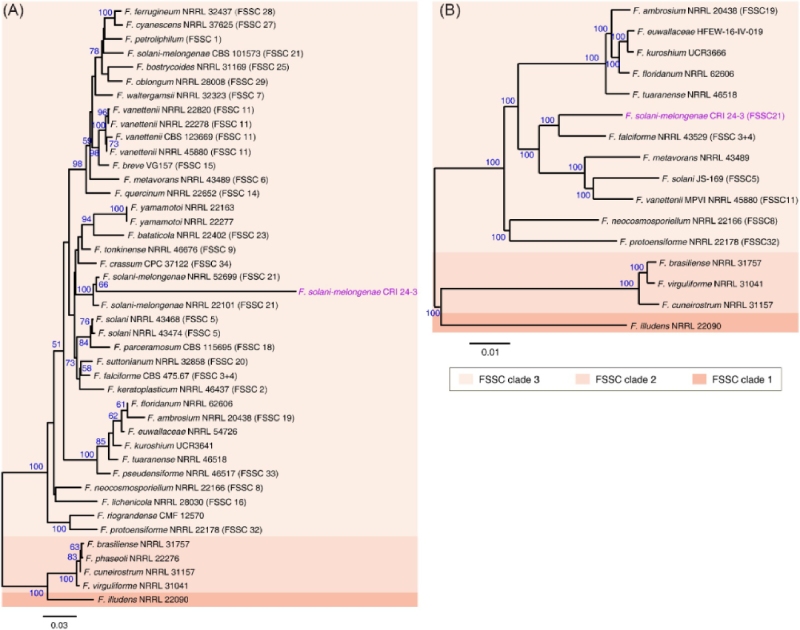 圖 4 CRI 24-3 和其他植物病原鐮刀菌的系統(tǒng)發(fā)育分析。 從?(A) ITS、RPB2 和 TEF 1-α 的串聯(lián)序列和 (B) 由 16 個(gè) FSSC 物種共享的 1,544 個(gè)單拷貝同源基因的組合序列推斷出的 ML 樹。?引導(dǎo)值(藍(lán)色)表示相關(guān)菌株聚集在一起的分支百分比。?括號中的阿拉伯?dāng)?shù)字區(qū)分了 FSSC 進(jìn)化枝 3 中系統(tǒng)發(fā)育不同的物種。