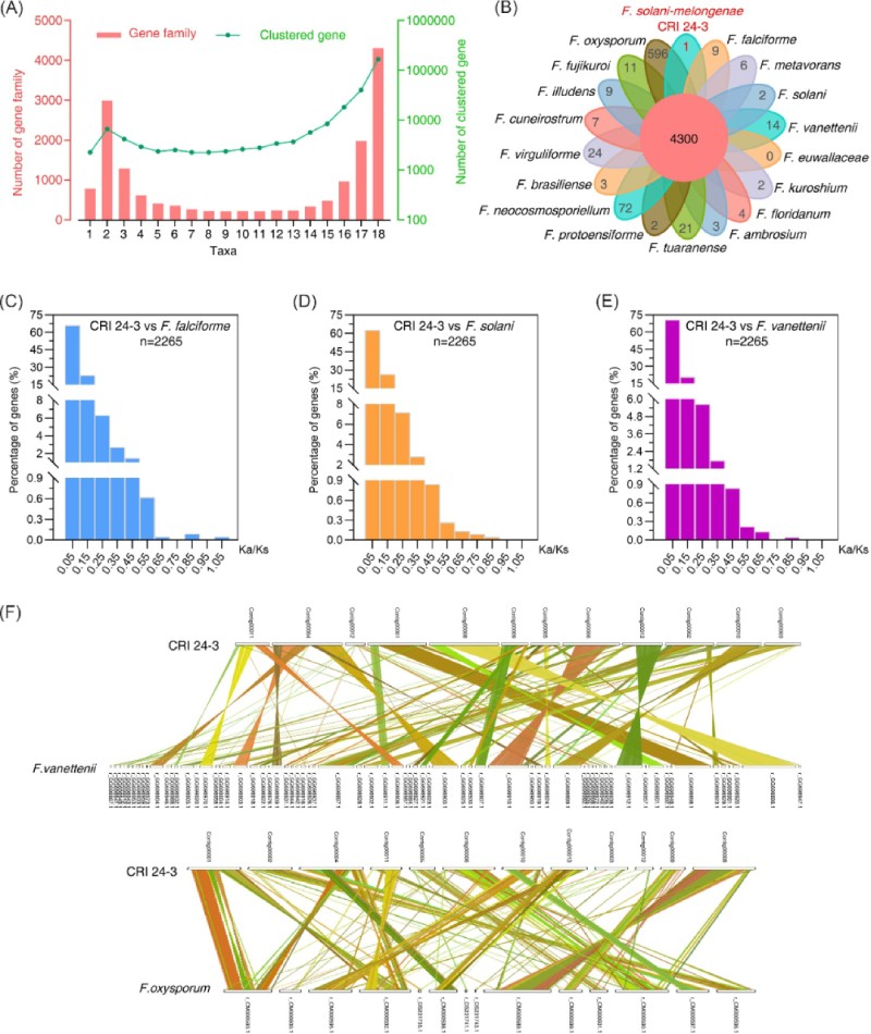圖6 CRI 24-3與其他鐮刀菌的基因組比較分析。 (A)基因家族和聚集在相應(yīng)家族中的基因數(shù)量從1到18不等。(B)花形維恩圖。?中心值表示 18 個(gè)鐮刀菌屬中所有共有基因家族的數(shù)量;?花瓣的值表示每個(gè)物種中特有基因家族的數(shù)量。?(C 到 E)CRI 24-3 和?F. falciforme、F. solani、F. vanettenii?之間基因?qū)Φ?Ka/Ks 比率分布。?小寫字母“n”后面的值表示所有檢測到的基因?qū)Φ臄?shù)量。?(F) 顯示基因組共線性的雙同線性圖。?不同顏色的線用于連接 CRI 24-3 和?F. vanettenii?(頂部) 或?F. oxysporum?(底部) 之間的直系同源基因?qū)Α?/p>