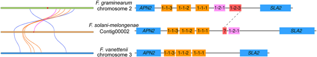 其他三種密切相關(guān)的 FSSC 物種F. falciforme、F. solaniF. vanettenii的基因組被用作參考基因組來探索 CRI 24-3 的選擇壓力。分別確定了 CRI 24-3 與?F. falciformeF. solani?F. vanettenii?之間的 2265、2272 和 2272 直系同源物對的非同義替換率 (Ka) 與同義替換率 (Ks) 的比率( 圖 6C 至 E)。Ka /Ks總體分析的值小于 1,表明 CRI 24-3 中的大多數(shù)直系同源物似乎都經(jīng)過了純化選擇并且高度保守。然而,CRI 24-3 和F. falciforme基因組的比較確定了一個(gè)快速進(jìn)化基因?qū)Γ‥VM0014458.1 與 GE10416_g)的 Ka /Ks比率大于 1,表明陽性選擇可能發(fā)生在進(jìn)化?;蚪M共線性分析表明,F. vanetteniiF. oxysporum基因組中的幾個(gè)染色體片段在 CRI 24-3 中濃縮成一個(gè)片段,并有一些倒位(圖 6F )。此外,CRI 24-3 中的一些直系同源物具有多對一的關(guān)系。CRI 24-3 中至少有兩個(gè)查詢基因與參考物種中的相同直系同源物匹配。值得注意的是,CRI 24-3 的重要基因組區(qū)域不能與尖孢鐮刀菌基因組中的那些共線性耦合,由 35.9% 的共線性率(共線直系同源物對與所有直系同源物對的比率)支持,該比率低于CRI 24-3 和F. vanettenii?(77.6%)。結(jié)果表明,CRI 24-3在系統(tǒng)發(fā)育上與尖孢鐮刀菌相距較遠(yuǎn)。MAT基因座對于在鐮刀菌屬中產(chǎn)生子囊孢子至關(guān)重要。在此,交配型結(jié)構(gòu)組織 ( MAT ) 基因座在基于簡化的共線性分析比較了茄科鐮孢菌CRI 24-3、禾谷鐮刀菌PH-1 和F. vanettenii?77-13-4(圖 7)。與僅攜帶 MAT1-1 基因的?F. vanettenii?77-13-4相比, CRI 24-3 含有MAT1-1和MAT1-2獨(dú)特型基因,在單個(gè)MAT基因座處與禾谷鐮刀菌密切相關(guān),除了 CRI 24-3 是 MAT1-2-3 缺陷型。只有位于 CRI 24-3 中 MAT1-2-1 上游區(qū)域的沒有任何特征功能域的片段與禾谷鐮刀菌中的 MAT1-2-3 具有序列相似性。