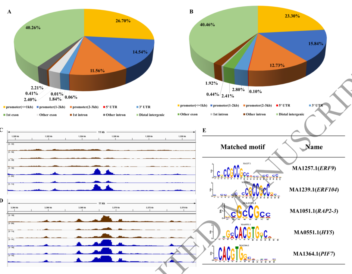 染色質(zhì)的開放區(qū)包含轉(zhuǎn)錄因子結(jié)合位點(TFBS),在轉(zhuǎn)錄因子(TFs)介導的基因表達調(diào)控中發(fā)揮重要作用。因此,作者通過對‘金鈴子’三個時期的果實材料進行ATAC-seq分析,以確定在生長過程中差異的染色質(zhì)開放區(qū)域。研究發(fā)現(xiàn),未成熟果實與破色期果實中,6號染色體上存在差異染色質(zhì)開放區(qū),主要是與類胡蘿卜素途徑和植物激素信號傳導相關(guān)的基因;破色期與成熟期果實相比,3號染色體上存在差異染色質(zhì)開放區(qū),主要的影響基因有乙烯應(yīng)答轉(zhuǎn)錄因子WRI1、乙烯應(yīng)答轉(zhuǎn)錄轉(zhuǎn)錄因子ERF118和生長素應(yīng)答因子1(ARF1)等。