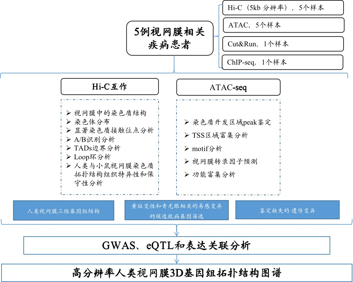 在過(guò)去視網(wǎng)膜疾病的全基因組關(guān)聯(lián)研究(GWAS)發(fā)現(xiàn)常見(jiàn)的變異主要在基因組非編碼區(qū)域,但由于先導(dǎo)變異區(qū)域的局部連鎖不平衡(LD),阻礙了特定關(guān)聯(lián)基因和變異的識(shí)別,因此闡明與性狀相關(guān)的遺傳變異如何影響調(diào)節(jié)基因表達(dá)網(wǎng)絡(luò),并因此影響表型,亟需了解相關(guān)組織和細(xì)胞類(lèi)型的3D基因組拓?fù)浣Y(jié)構(gòu)。