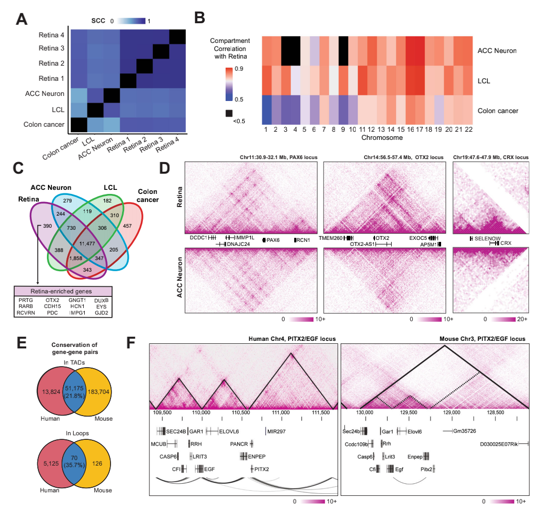 小鼠和人類(lèi)染色質(zhì)組織之間的相似性表明了跨物種的守恒,強(qiáng)調(diào)了染色質(zhì)組織模式與視網(wǎng)膜基因調(diào)控的相關(guān)性。發(fā)現(xiàn)小鼠TAD中21.8%的小鼠基因?qū)σ参挥谙鄳?yīng)的人類(lèi)TAD中,超過(guò)三分之一(35.7%)的基因?qū)υ谛∈篌w內(nèi)通過(guò)染色質(zhì)環(huán)相互作用,在人類(lèi)視網(wǎng)膜中也是如此。