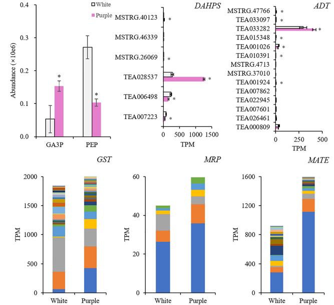選擇與AP和DpG高度相關(guān)的轉(zhuǎn)錄因子(TFs),研究它們與差異表達(dá)的結(jié)構(gòu)基因的相關(guān)性。結(jié)果顯示MYB、AP2/ERF、bZIP、TCP、GATA等基因顯著表達(dá),并專注于Phe上游合成基因的調(diào)控(DAHPS;和AP(苯乙醛還原酶、短鏈脫氫酶/還原酶)、Dp(F3H;F3?5?H)和DpG(BZ1)的合成,但抑制黃酮(黃酮醇合酶)和兒茶素(白花青素還原酶)的形成。這些結(jié)果發(fā)現(xiàn)了紫茶樹中揮發(fā)性BPs的促進(jìn)作用,擴(kuò)展了我們對(duì)BPs型顏色與香氣關(guān)系的理解。
