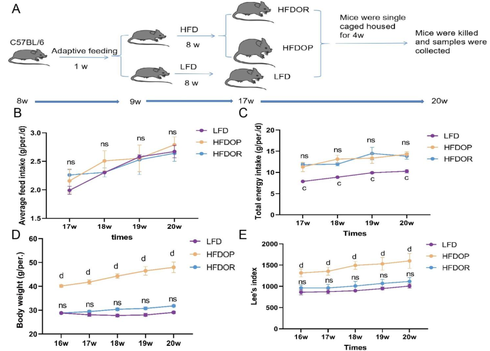 然而,HFDOR組的肝臟、總脂肪和總內(nèi)臟脂肪的重量顯著低于HFDOP組(圖1H-J)。HFDOP組AST、ALT、HDL、LDL、TG和TC水平較LFD組顯著升高(圖3K-P)。然而,HFDOR組的AST、ALT、高密度脂蛋白、低密度脂蛋白和甘油三酯水平顯著低于HFDOP組(圖3K-O)。盡管HFDOR組的TC水平低于HFDOP組,但差異無統(tǒng)計(jì)學(xué)意義。