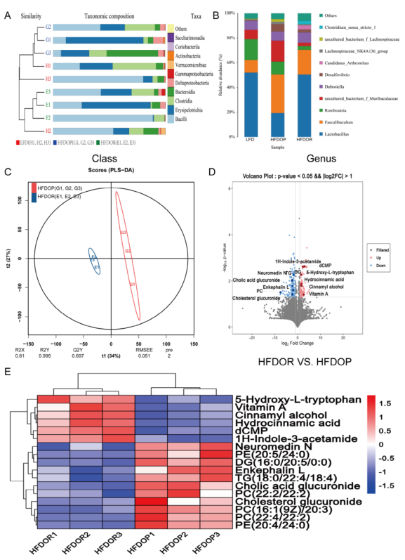 小腸內(nèi)容物非靶向代謝組學(xué)的結(jié)果如圖3C-E 所示,PLS-DA 分析表明 HFDOR 和 HFDOP 組之間的明顯分離(圖3C)。在小腸內(nèi)容物中共檢測(cè)到 314 種差異代謝物(圖3D)。相關(guān)性分析表明,Desulfovibrio、Bifidobacterium和Gemella都與 PC、DG 和膽酸葡糖苷酸呈正相關(guān),而與維生素 A、dCMP、肉桂醇、5-HT 和肉桂酸葡糖苷酸呈負(fù)相關(guān)(圖3E)。Clostridium_sensu_stricto_1 和 Ralstonia 與維生素 A、dCMP、肉桂醇、5-HT、1 H-吲哚-3-乙酰胺和氫化肉桂酸呈正相關(guān),與 PC、PE、TG、DG、neuromedin N、腦啡肽 L 和膽固醇葡糖苷酸呈負(fù)相關(guān)(圖 4)。