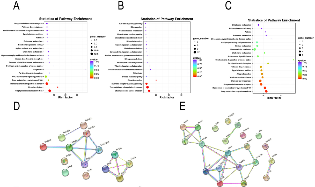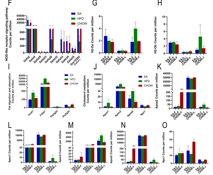 對(duì)共有DEG進(jìn)行功能富集分析,發(fā)現(xiàn)顯著富集的通路主要與宿主先天防御和脂質(zhì)代謝相關(guān)(圖3A);在去除功能未鑒定的基因或lncRNA后,獲得140個(gè)上調(diào)和92個(gè)下調(diào)的DEG也進(jìn)行功能富集分析(圖3B, 3C);然后,對(duì)top20通路的DEG進(jìn)行PPI調(diào)控網(wǎng)絡(luò)分析(圖3 D, 3E),結(jié)果顯示,EA主要上調(diào)的通路包括α防御素基因在內(nèi)的NOD樣受體信號(hào)通路(圖3 D),下調(diào)的通路脂質(zhì)代謝(包括脂質(zhì)消化和吸收途徑),以及免疫應(yīng)答相關(guān)通路(谷胱甘肽s-轉(zhuǎn)移酶和MHC II類相關(guān)基因)(圖3E)。基因表達(dá)直方圖顯示EA干預(yù)恢復(fù)大量異常表達(dá)的DEG,與腸粘膜免疫相關(guān)的DEG,如α防御素基因,可以通過EA顯著恢復(fù)(圖3F);與免疫反應(yīng)相關(guān)的H2-Ob和H2-OA僅在空腸區(qū)域下調(diào)(圖3G, 3H);EA干預(yù)恢復(fù)了fabp1、pla2g2d和acat1的表達(dá)水平,主要負(fù)責(zé)脂肪消化和吸收(圖3I);最后,EA干預(yù)通過下調(diào)apoc1、apoa2和apoc2以及上調(diào)npc1來調(diào)節(jié)膽固醇代謝(圖3J-O)。