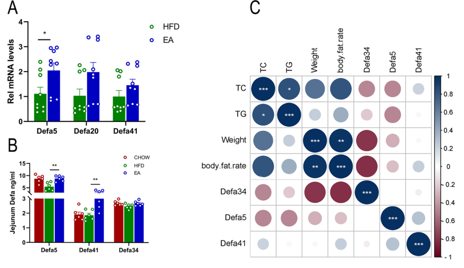 4. Defa5水平與毛螺菌科呈正相關(guān),與肥胖指標(biāo)呈負(fù)相關(guān),EA還可以減少組織炎癥,改善葡萄糖耐量異常,并抑制腸道脂質(zhì)吸收的關(guān)鍵基因。