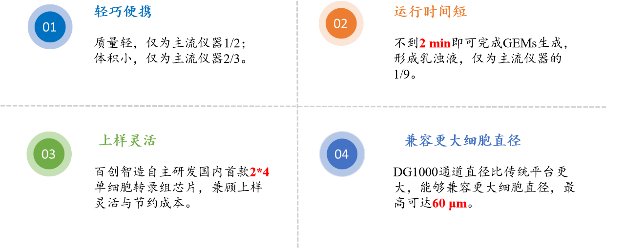 百創(chuàng)DG1000突破直徑壁壘:為了突破單細(xì)胞試劑耗材及儀器長(zhǎng)期以來(lái)的國(guó)外技術(shù)壟斷,降低單細(xì)胞應(yīng)用的成本,突破主流平臺(tái)40μm細(xì)胞直徑限制,滿足更多的單細(xì)胞場(chǎng)景需求。經(jīng)過(guò)潛心研發(fā),百邁客發(fā)布了自主研發(fā)的單細(xì)胞微液滴系統(tǒng)-百創(chuàng)DG1000。