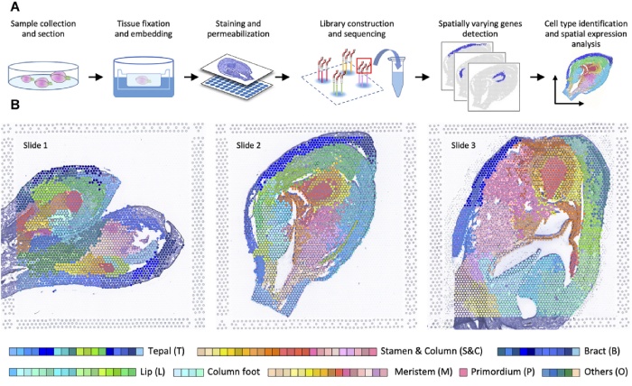 研究?jī)?nèi)容:利用10x Visium空間轉(zhuǎn)錄組學(xué)數(shù)據(jù)分析了蝴蝶蘭花器官早期發(fā)育過(guò)程中基因表達(dá)的動(dòng)態(tài)變化。通過(guò)對(duì)時(shí)空表達(dá)分布的比較,確定了在特定組織/階段優(yōu)先表達(dá)的數(shù)千個(gè)基因,包括MADS-box基因和許多其他潛在下游基因,形成了花器官初始化、身份決定和形態(tài)建成的模型。對(duì)蘭花開(kāi)花發(fā)育過(guò)程進(jìn)行了系統(tǒng)的研究,為進(jìn)一步研究蘭花開(kāi)花過(guò)程中復(fù)雜而重要的基因調(diào)控網(wǎng)絡(luò)提供了寶貴的資源。