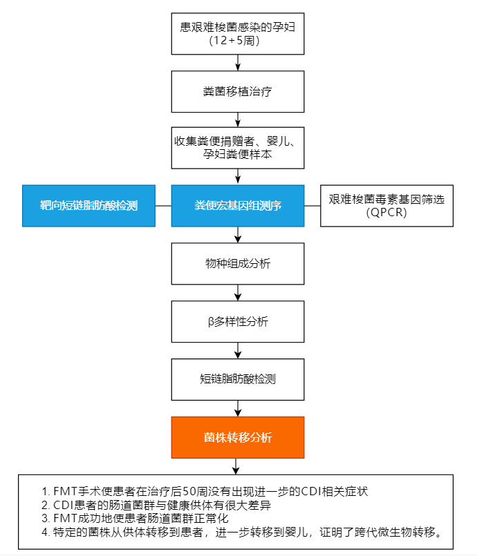 該研究通過對(duì)糞便捐獻(xiàn)者、孕婦和嬰兒的糞便樣本進(jìn)行宏基因組測(cè)序和菌株水平分析,并進(jìn)一步與收集的651名健康嬰兒和58名健康成年人的宏基因組樣本進(jìn)行比較,發(fā)現(xiàn)一些特定的菌株從捐贈(zèng)者轉(zhuǎn)移到患者身上,然后轉(zhuǎn)移到嬰兒,證明了跨代微生物轉(zhuǎn)移。