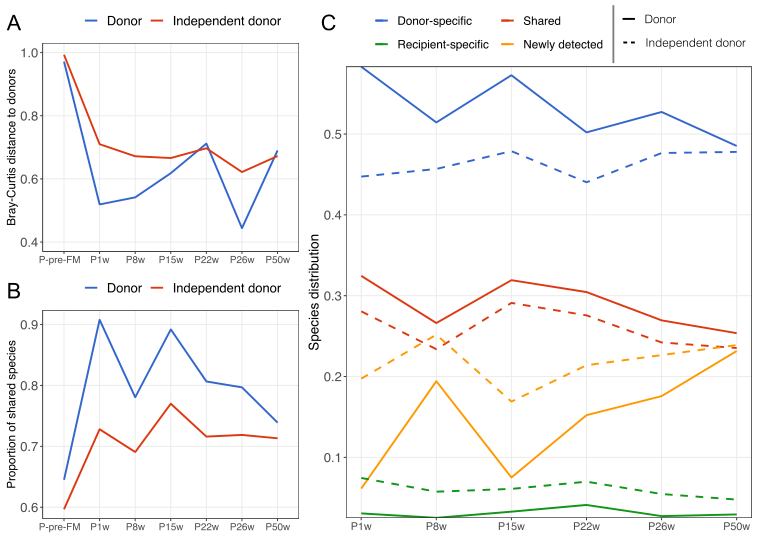 進(jìn)一步評(píng)估了患者與實(shí)際供體或獨(dú)立供體之間隨時(shí)間推移在物種/MGS 水平上的腸道菌群差異(圖2A)。供體和患者之間的 Bray-Curtis 距離在 FMT 前非常大,但在 FMT 后 1 周顯著減少,此后呈逐漸增加趨勢(shì),直到第 50 周,除了在第 26 周出現(xiàn)無法解釋的減少。估計(jì)了隨著時(shí)間的推移患者和供體之間共有物種的比例(圖2B)。在 FMT 之前,患者有 64.5% 的物種與供體相同,而在 FMT 之后,該比例在第1周增加到 90.8%,并且在 FMT 后 50 周之前一直保持較高水平,盡管有下降趨勢(shì)。獨(dú)立供體與患者共享的物種要少得多(圖 B)。