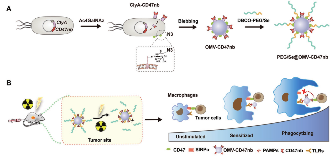 CD47納米抗體(CD47nb)融合到OMV表面(OMV-CD47nb),OMV-CD47nb可以同時與腫瘤細胞的CD47和TAMs的TLRs結合;外表面涂有含有二烯酰胺鍵(PEG/Se)的聚乙二醇(PEG)層,形成PEG/Se@OMV-CD47nb,PEG/Se層的修飾可以減輕了OMV-CD47nb的免疫原性,顯著提高給藥劑量;