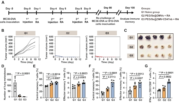為了確定通過輻射觸發(fā)的OMV-CD47nb傳遞是否能激活免疫記憶,對構建好的PEG/Se@OMVs+RA、PEG/Se@CD-CD47nb+RA處理的MC38-OVA和B16-OVA皮下成瘤小鼠進一步分析(圖4A)。結果顯示,PEG/Se@OMVs+RA和PEG/Se@CD-CD47nb+RA處理的MC38-OVA小鼠腫瘤沒有生長,達到100%的腫瘤抑制率(圖4B),但PEG/Se@OMVs+RA和PEG/Se@CD-CD47nb+RA處理的B16-OVA組分別達到了 91.2%和98.2%的肺部轉移抑制率(圖4C, D);與對照組相比,PEG/Se@OMVs+RA和PEG/Se@CD-CD47nb+RA治療得小鼠血液和脾臟的中央記憶型T細胞和效應記憶T細胞比例顯著上調(diào)(圖4E, F);PEG/Se@OMVs+RA組中記憶T細胞比例略高于PEG/Se@CD-CD47nb+RA組,這與B16-OVA細胞的肺轉移抗腫瘤效果一致(圖4D);PEG/Se@OMVs+RA和PEG/Se@CD-CD47nb+RA處理的小鼠脾臟細胞仍然擁有識別腫瘤抗原的能力,表現(xiàn)為OVA抗原重新刺激上調(diào)CD3+CD8+T細胞中IFNγ+細胞的比例(圖4G)。以上結果表明,PEG/Se@CD-CD47nb+RA治療誘導腫瘤抗原特異地適應性免疫,激活了腫瘤抗原的免疫記憶,提供了長期的腫瘤預防效果。