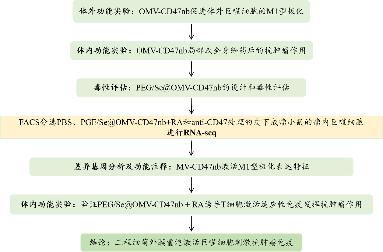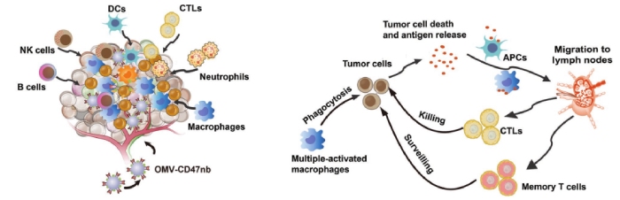 細菌衍生的外膜囊泡(OMV)是高免疫原性納米囊泡,已經(jīng)成為腫瘤免疫治療常用的傳遞載體;巨噬細胞作為腫瘤微環(huán)境(TME)中的抗原遞呈細胞,可以處理被吞噬的腫瘤細胞,并將腫瘤抗原呈遞給T細胞,從而激活抗原特異性免疫反應,腫瘤細胞表現(xiàn)出CD47“don’t eat me”信號的高表達,阻礙了巨噬細胞的吞噬作用;腫瘤相關巨噬細胞(TAM)與免疫抑制性M2極化巨噬細胞非常相似,與腫瘤免疫逃逸和腫瘤進展有關,TAMs的jing q高效激活是一種非常有前景的腫瘤免疫治療方法。