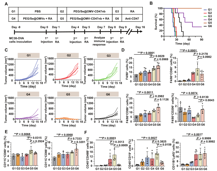 分別構建PBS、PEG/Se@OMV-CD47nb、RA(局部放射治療)、PEG/Se@OMV+RA、PEG/Se@OMV-CD47nb+RA、anti-CD47處理的MC38-OVA皮下成瘤小鼠模型(表達卵清蛋白的MC38小鼠結腸癌細胞系),評估抗腫瘤效果(圖2A)。結果顯示,90天后,PEG/Se@OMV-CD47nb+RA組小鼠存活率100%,PEG/Se@OMV+RA組小鼠存活率33.3%,其余組小鼠均全部死亡(圖2B);單獨RA與PEG/Se@OMV-CD47nb處理沒有引起明顯的抗腫瘤活性,而RA與PEG/Se@OMV-CD47nb聯(lián)合顯示出顯著的抗腫瘤效果,但并且與臨床上使用的陽性對照anti-CD47相比,CD47nb的抗腫瘤作用更強(圖2C)。