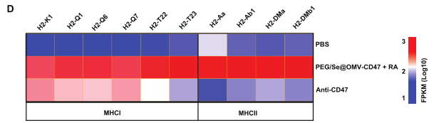 與PBS組相比,PGE/Se@OMV-CD47nb+RA組中的VEGFA、VEGFB、HGF、PDGFA、MMP2、MMP9、MMP10和MMP11表達水平下調(diào)(圖3C),這些基因與TAMs促進腫瘤血管生成和轉移相關;此外,多種MHC Ⅰ、MHC Ⅱ類分子表達水平顯著上調(diào),表明腫瘤細胞的吞噬和抗原呈遞可能發(fā)生在TAMs中。