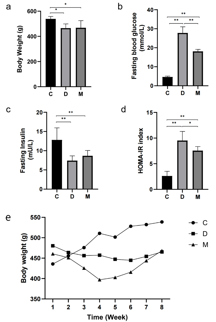MOTS-c治療8周后,D組和M組大鼠體重低于C組(圖1a和圖1e)。與D組相比,M組大鼠空腹血糖水平降低(圖1b)。此外,與C組相比,D組和M組大鼠胰島素水平下降,D組和M組間胰島素水平無顯著差異(圖1c)。通過計算HOMA-IR指數(shù)評估胰島素抵抗。與C組相比,D組大鼠的HOMA-IR指數(shù)顯著升高,而M組大鼠HOMA-IR指數(shù)較D組降低。