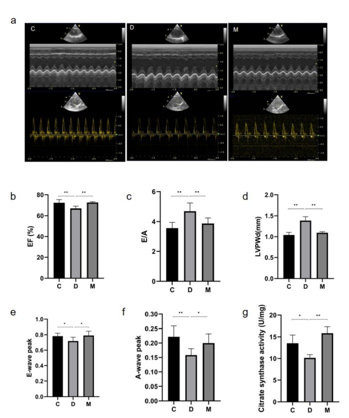 該研究利用透射電鏡測定了MOTS-c對糖尿病心肌超微結(jié)構(gòu)的影響。糖尿病引起心肌纖維排列紊亂和線粒體結(jié)構(gòu)的異常改變,包括心肌細胞排列不規(guī)則、嵴破裂、腫脹和空泡化(圖2)。MOTS-c治療糖尿病大鼠顯著降低心肌線粒體損傷,改善心肌纖維和線粒體結(jié)構(gòu)(圖2)。研究還通過測定檸檬酸合酶的活性,測定了線粒體功能。D組大鼠檸檬酸合酶的活性顯著降低,C組和M組的檸檬酸合酶的活性無統(tǒng)計學差異(圖3g)。