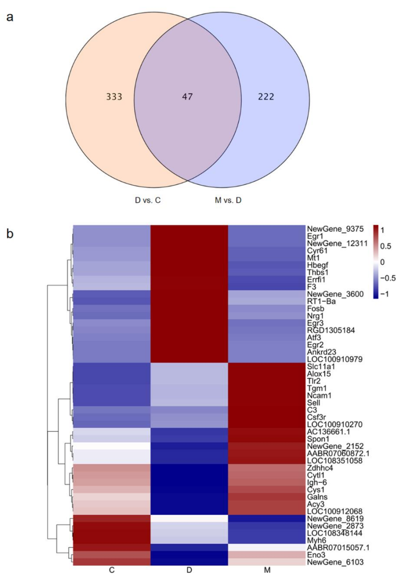 為了進一步探究糖尿病大鼠對MOTS-c的適應性反應的機制,研究者利用RNA-Seq技術(shù),測定了心肌組織基因全長轉(zhuǎn)錄表達。以C組為對照,D組表現(xiàn)出的差異表達基因(DEGs)即致病基因,再以D組為對照組篩選出M組的差異表達基因,二者篩選出的DEGs中重疊的基因即為MOTS-c改變的致病基因。將以上步驟執(zhí)行,篩選出47個MOTS-c改變的致病基因(圖4a)。將這47個基因進行熱圖分析后發(fā)現(xiàn),C組基因表達趨勢與D組相反,而與M組近似(圖4b)。