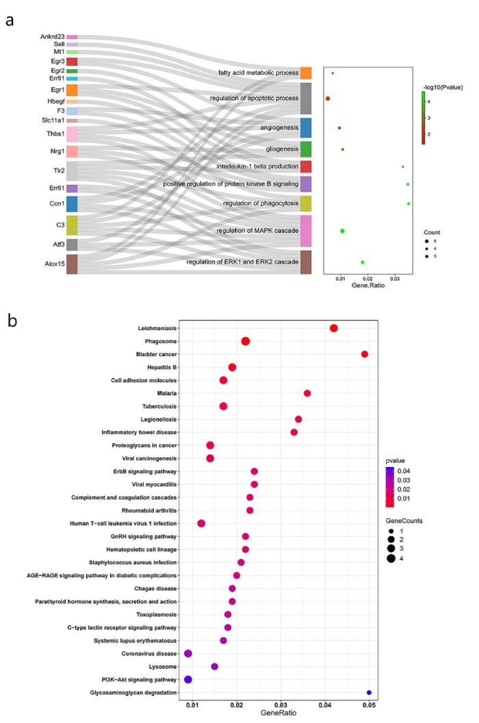 采用Gene Ontology(GO)與Kyoto Encyclopedia of Genes and Genomes(KEGG)對MOTS-c所改變的47個致病基因進行功能富集分析。GO 注釋系統(tǒng)包含三個主要分支,即:生物學過程(BP)、分子功能(MF)和細胞組分(CC)。)8 周 MOTS-c 注射所改變的 47 個糖尿病致病基因共富集于 195 個 GO term 中,其中 188 個 term 富集于 BP,2 個 term 富集于 CC,5 個 term 富集于MF。經(jīng)過 ClueGO 聚類分析后,195 個 term 主要富集于 9 個類別(見圖 5b),分別為血管生成(angiogenesis)、凋亡過程調(diào)控(regulation of the apoptotic process)、MAPK 級聯(lián)調(diào)控(regulation of MAPK cascade)、蛋白激酶活性正調(diào)控(positive regulation of protein kinase activity)、脂肪酸代謝過程(fatty acid metabolic process)、吞噬作用調(diào)節(jié)(regulation of phagocytosis)、蛋白激酶 B 信號正調(diào)控(positive regulation of protein kinase B signaling)、ERK1/2 級聯(lián)(regulation of ERK1/2 cascade)、膠質(zhì)生成(gliogenesis)和白細胞介素-1 的產(chǎn)生(interleukin-1 beta production)。KEGG通路富集分析顯示,18條KEGG通路顯著富集(圖5b),其中5條信號通路與免疫、凋亡和糖代謝相關(guān)(ErbB信號通路、補體和凝血級聯(lián)、c型凝集素受體信號通路、PI3K-Akt信號通路和AGE-RAGE信號通路)。在功能富集通路注釋基因中,ALOX15、ATF3、CCN1、EGR1、EGR3、ERRFI1、THBS1、TLR2和NRG1高頻率注釋。CCN1與EGR1基因高表達,同時均注釋在凋亡相關(guān)的GO term中,而CCN1也注釋于富集顯著性最高的ERK1/2級聯(lián)通路中,表明CCN1、ERK1/2與EGR1可能是相互關(guān)聯(lián)的關(guān)鍵基因。
