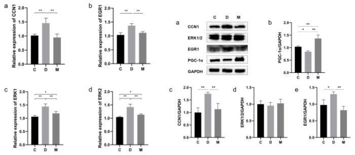 為了驗證CCN1、ERK1/2與EGR1是否在MOTS-c改善糖尿病心臟結(jié)構(gòu)與功能中發(fā)揮重要作用,也為了進一步探究MOTS-c對線粒體發(fā)生的作用,研究者利用RT-PCR與Western Blotting技術(shù)測定了CCN1、ERK1/2、EGR1的基因表達與蛋白表達以及線粒體發(fā)生標志蛋白PGC-1α的蛋白表達。結(jié)果表明,MOTS-c治療后,糖尿病大鼠心肌中PGC-1α蛋白表達顯著上升(圖7a);CCN1、ERK1/2和EGR1基因表達顯著降低(圖6);CCN1、EGR1蛋白表達顯著降低,ERK1/2的總蛋白表達量不變(圖7),但多個研究表明MOTS-c僅影響ERK1/2的磷酸化水平。