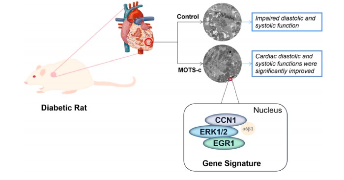 為期8周的MOTS-c治療減少了糖尿病患者的心功能障礙與線粒體損傷,MOTS-c可能是通過調(diào)節(jié)脂肪酸代謝、免疫調(diào)節(jié)、血管生成和細胞凋亡產(chǎn)生作用。CCN1/ERK1/2/EGR1的信號轉(zhuǎn)導可能在MOTS-c抑制心肌細胞凋亡中發(fā)揮重要作用。
