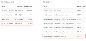 (1)數(shù)據(jù)相關(guān)統(tǒng)計:新增有效reads數(shù)及占比、基因反義鏈比對率